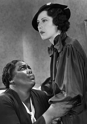 Walter’s favorite whipping girl, Oscar-winning Hattie McDaniel—for her series of stereotypical maid roles—got a career jumpstart because of a film that dealt with passing. Imitation of Life (IOL) starred a white woman, Claudette Colbert, and a black one, Louise Beavers, as mothers struggling to raise willful daughters. Till then, black folks were mainly on the margins of Hollywood films, but 1934’s IOL put the two women’s stories on nearly equal footing. The black woman’s greatest challenge was her daughter, Peola, played by uber light-skinned Fredi Washington fredi and louise(photo at left) who decides to pass for white for more opportunity and less hassle. Peola reclaims her blackness too late, returning home after her mother has died pining for her.